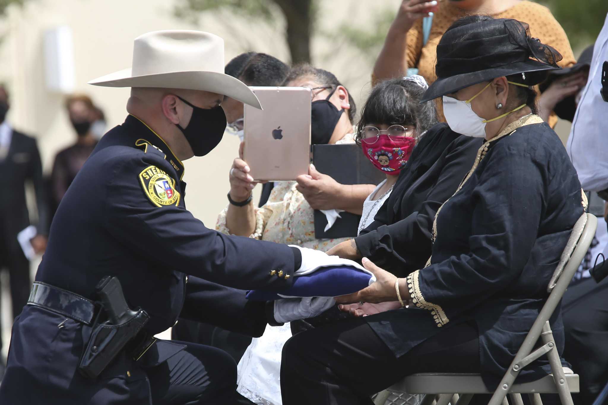 The wail of bagpipes and beating of drums signaled the start of a memorial service for San Antonio’s first law enforcement officer to die as a result of the novel coronavirus.