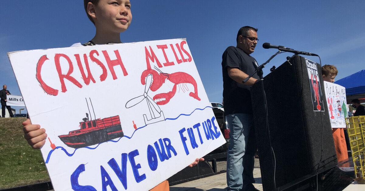 The state’s fishing industries, led by lobstermen, are united in opposition. Hundreds turned out for a rally at the Augusta Civic Center, in an unusual show force on a good fishing day. Many bore homemade signs saying "Crush Mills," in a play on the term windmills and the governor's last name.