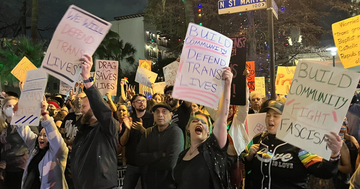By 7 p.m., supporters and critics of the drag show filled the sidewalks on opposite sides of St. Mary's Street, near its intersection with Crockett Street. Some of the participants supporting the show held signs celebrating LGBTQ rights, waved flags, danced to music and chanted. TPR estimated the LGBTQ side numbered more than 100 people.